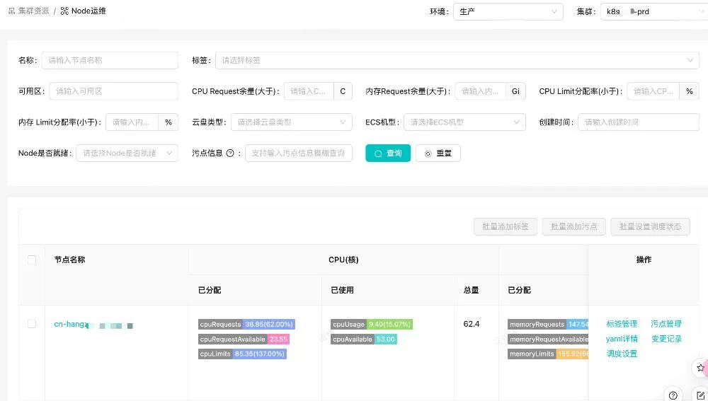 支持通过标签、污点、CPU/内存余量、磁盘类型、可用区等维度快速筛选节点。3.批量打标与调度