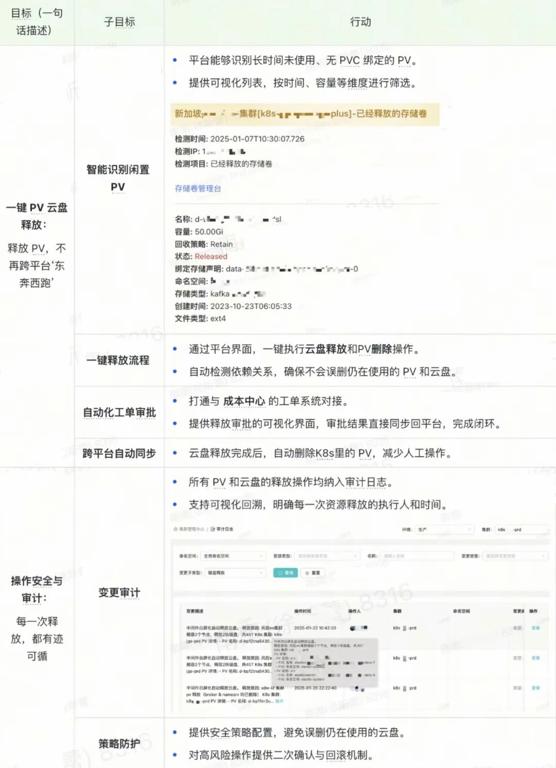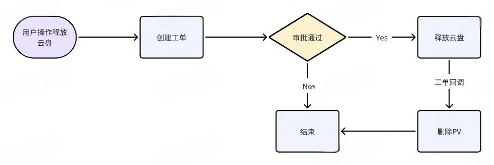 云盘释放 → 成本中心审批 → 云厂商控制台删除 PV,整个流程需要跨平台、跨系统完成,且容易出错。解决方案目标:实现 PV 云盘资源的可视化、自动化管理,打通从 Kubernetes 到云厂商的全链路操作流程。如下图所示: