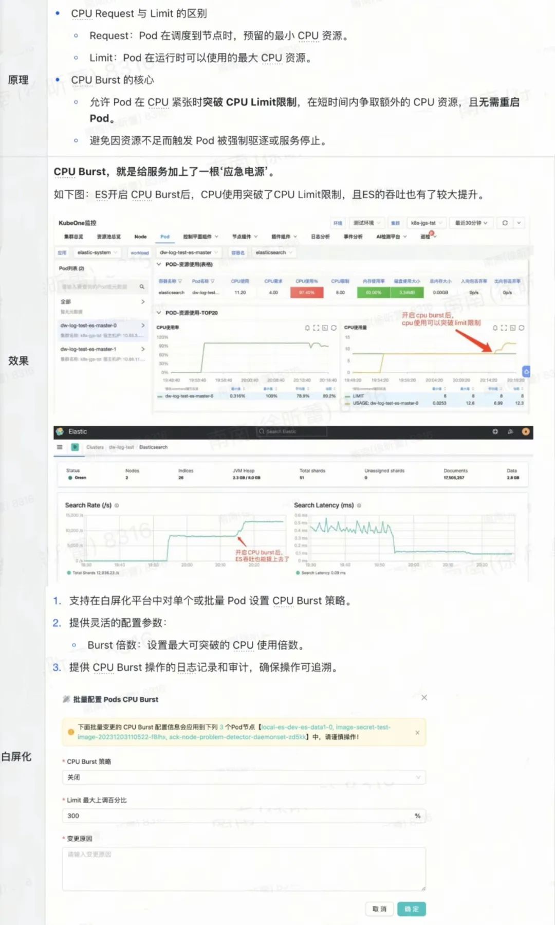 截止目前, CPU Burst 已在 10+ 套 Kubernetes 集群 和 30+ 套 ES 集群 中启用。在高并发场景下,有效解决了 CPU受限和CPU使用率瓶颈问题,提升了服务稳定性。