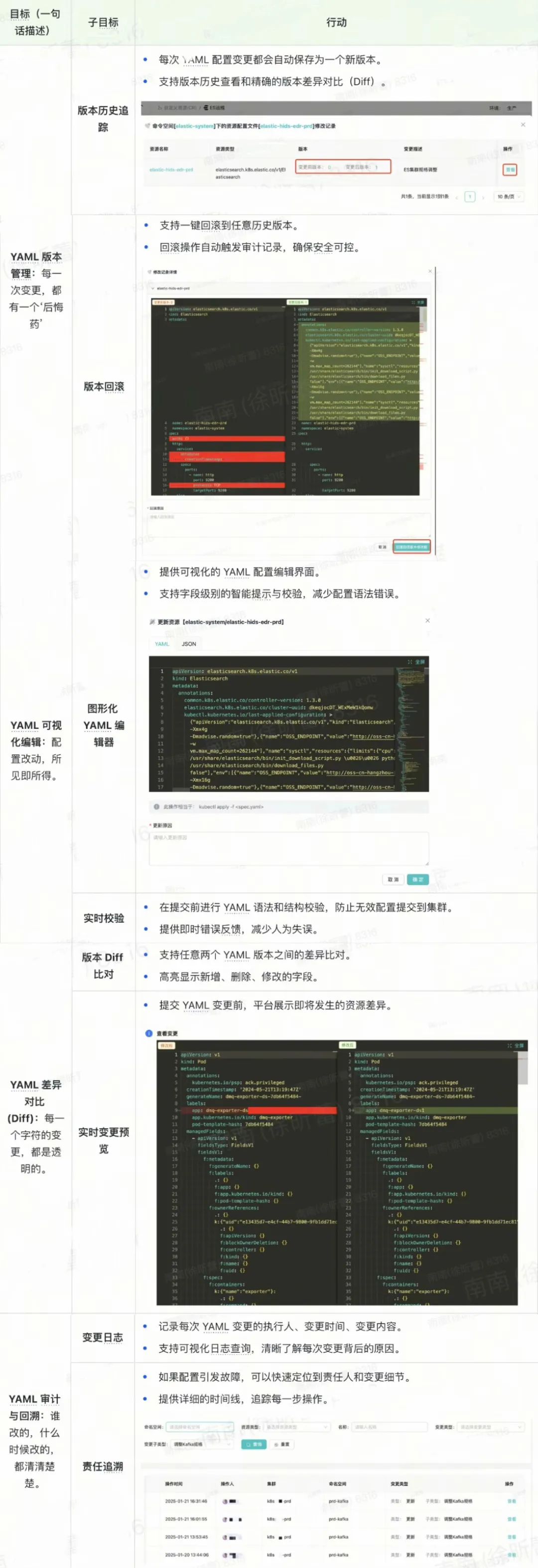 直接使用 kubectl apply 进行 YAML 修改,存在人为输入错误的风险。缺少可视化的配置变更比对工具,难以进行精确的差异分析。配置变更失败后,回滚通常需要手动恢复之前的版本。缺乏自动化的回滚机制,出错后容易引发连锁反应。解决方案目标:通过YAML 管理服务,将 Kubernetes YAML 配置的版本管理、变更审计、回滚机制 和 可视化管理 集中整合到平台中,降低人为操作风险,提升变更效率和安全性。如下所示: