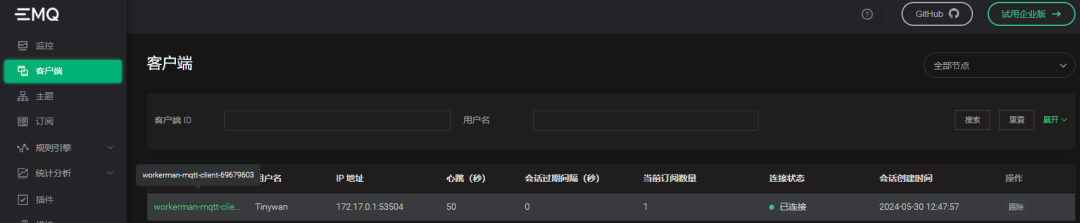 启动成功后,即可看到设备已经成功连接到服务器。我们在 EMQX 服务器中的客户端页面中可以查看到设备的连接状态。