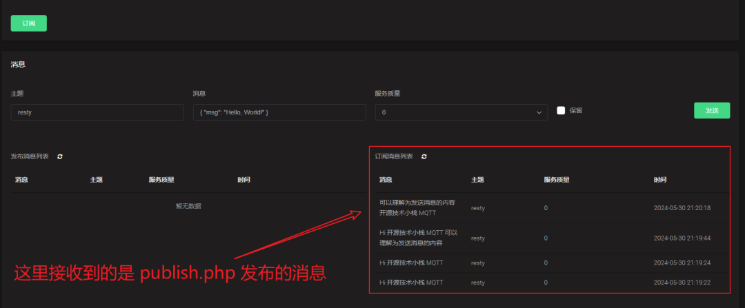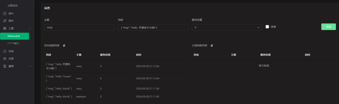 接下来,我们测试发布和订阅主题是否正常。