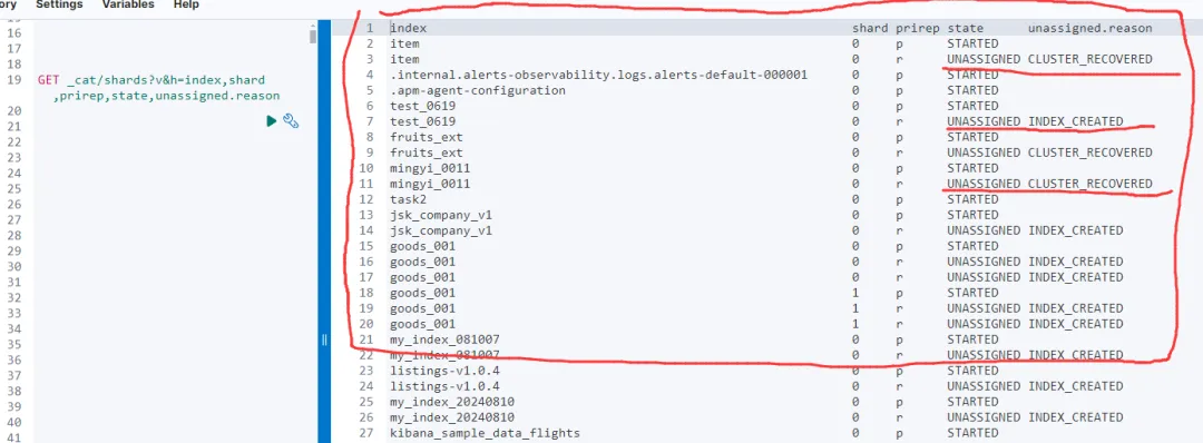 重点检查 unassigned.reason 字段,确保没有未分配的分片。如果发现未分配的分片,可以使用以下命令重新分配: