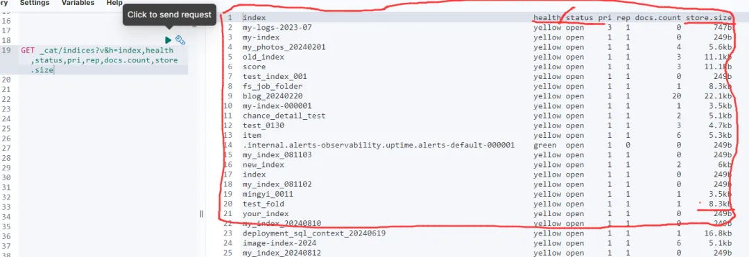 health:索引健康状态status:索引状态pri:主分片数量rep:副本分片数量docs.count:文档数量store.size:索引大小