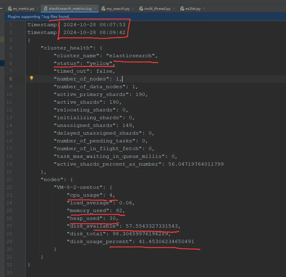 为了持续监控 Elasticsearch 集群的健康状态、CPU、内存、负载、磁盘使用率等指标,可以使用 Python 脚本结合定时任务实现自动化采集。我早期项目是借助 shell 脚本实现,原理一致