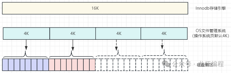 lnnoDB存储引擎中缓存页和操作系统的页大小不一致,lnnoDB页大小默认为16K(可以设置),操作系统页默认大小为4K,当InnoDB的页写入到磁盘时,一个页需要分4次写,如下图所示: