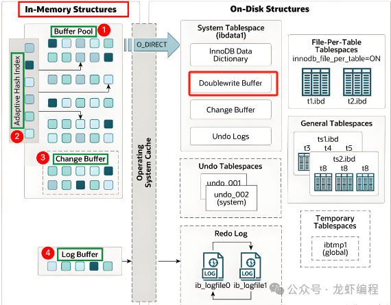 (2)双写缓冲区通过在数据页写入磁盘之前,先将数据页写入系统表空间中,确保即使在写入过程中发生宕机,也可以通过系统表空间中的数据页副本恢复损坏的数据页。