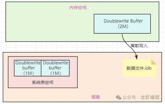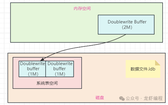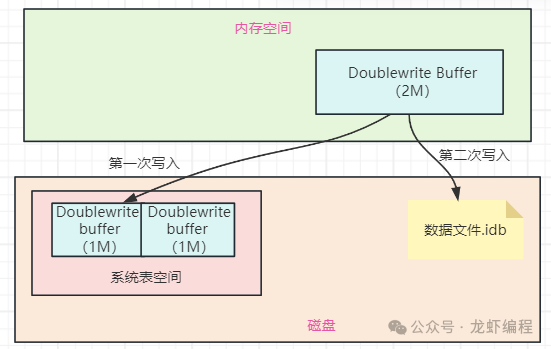 为了解决写失效问题,Mysql引入了双写缓冲区(Double Write Buffer,它是InnoDB存储引擎的一种机制,用于解决部分写失效的问题,提高数据完整性和可靠性),InnoDB存储引擎中,系统表空间的有双写缓冲区,如下图所示: