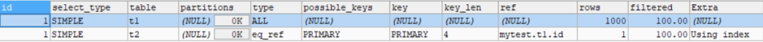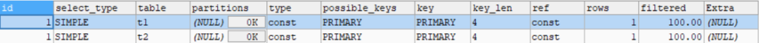 EXPLAIN SELECT t1.*,t2.c AS c FROM test1 t1 JOIN test2 t2 ON t1.id = t2.id WHERE t1.id = 1 ;1.