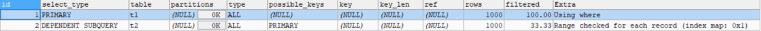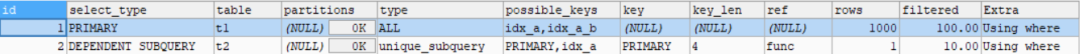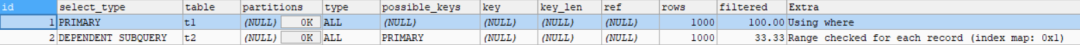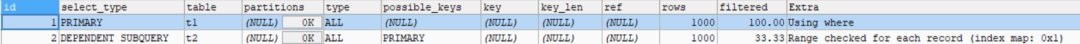 UNION RESULT: UNION 语句的结果集,id 为 NULL,见上面 SQL 执行计划。DEPENDENT UNION: UNION 中的第二个及以后 SELECT 是相关子查询(依赖外层查询)。