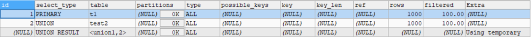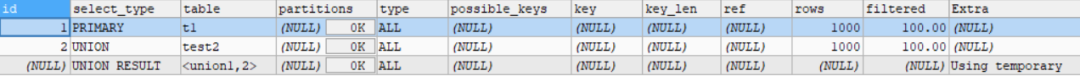 EXPLAIN SELECT * FROM test1 t1 UNION SELECT * FROM test2;1.