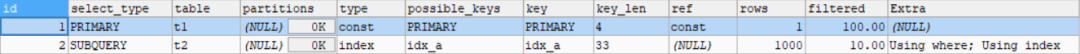EXPLAIN SELECT * FROM test1 t1 WHERE t1.id =(SELECT id FROM test2 t2 WHERE t2.a=100)1.