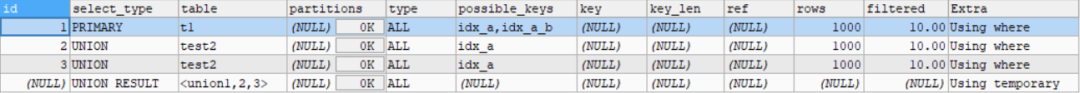 EXPLAIN SELECT * FROM test1 t1 WHERE a=1 UNION SELECT * FROM test2 WHERE a=2 UNION SELECT * FROM test2 WHERE a=3;1.