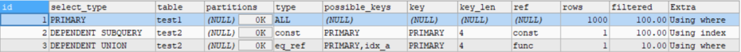 EXPLAIN SELECT * FROM test1 WHERE id IN (SELECT id FROM test2 WHERE id=3 UNION ALL SELECT id FROM test2 WHERE a = 2)1.