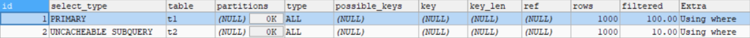 UNCACHEABLE SUBQUERY: 结果集不能被缓存的子查询,必须重新为外层查询的每一行进行评估,出现极少。(可能包含非确定性函数如 RAND(), NOW())。