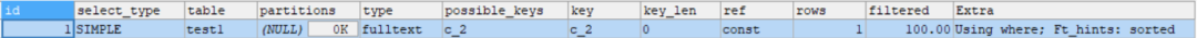 ALTER TABLE test1 ADD FULLTEXT (c); EXPLAIN SELECT * FROM test1 WHERE MATCH(c) AGAINST(keyword);1.2.