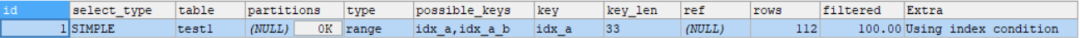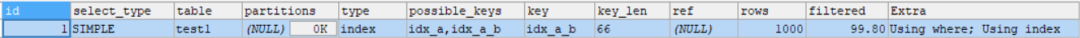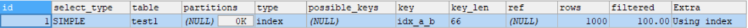 以文章开头的 SQL 为例,给 a、b 字段加了联合索引,下面 SQL 的执行计划看一下:
