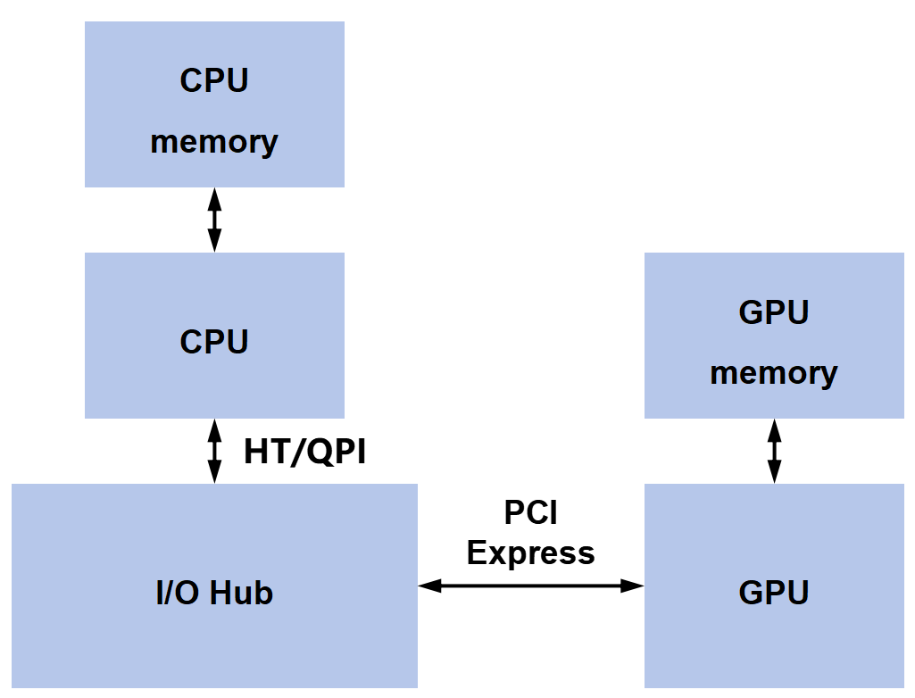 GPU显存的速度快但容量小,CPU内存的速度慢但容量大。因为内存系统的差异,加速的计算应用一般先把数据从网络或磁盘移至CPU内存,然后再复制到GPU显存,数据才可以被GPU处理。