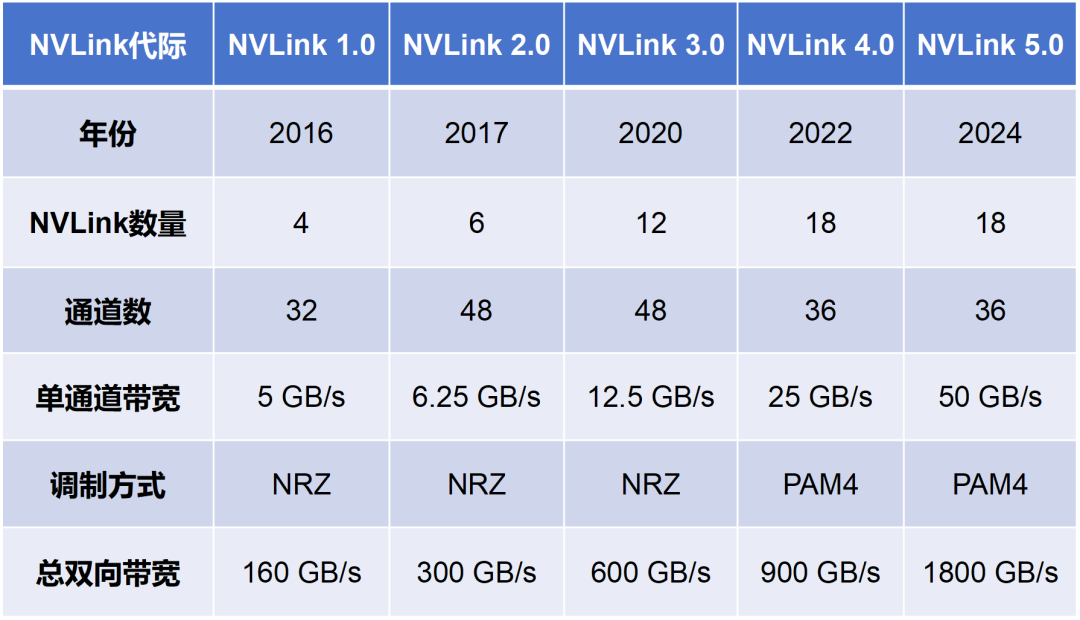 迄今为止,英伟达陆续推出了NVLink 1.0~5.0,参数我就不一一介绍了,可以看下面的表格: