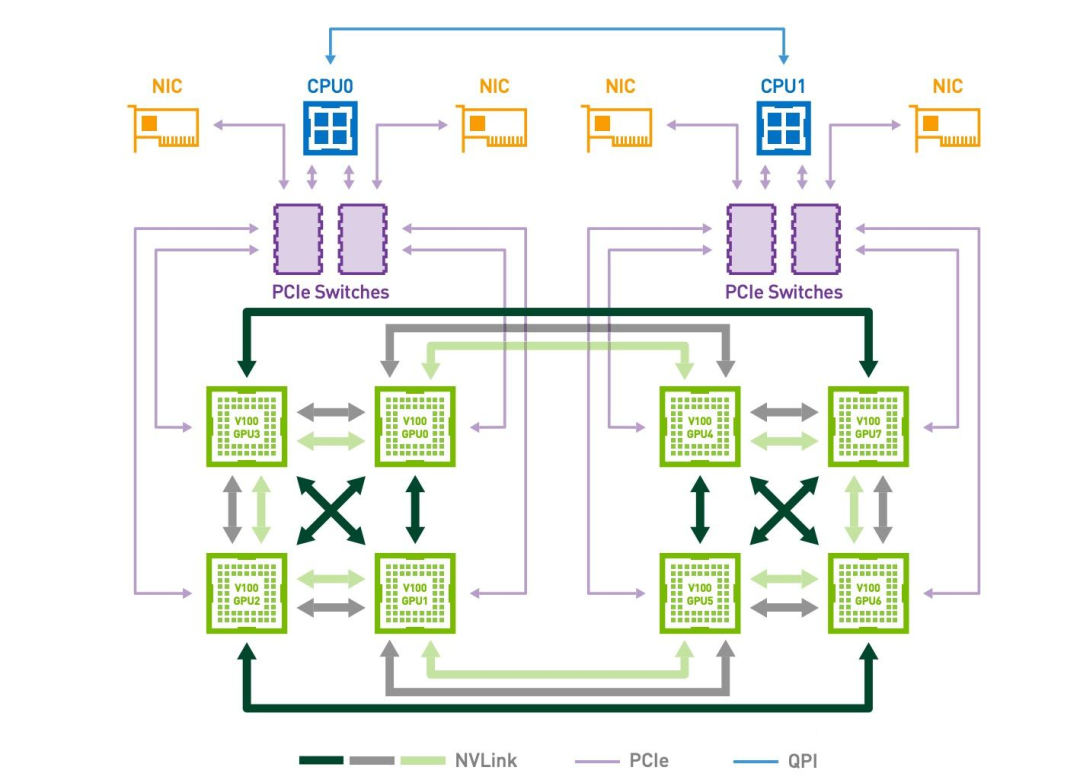 Hybrid Cube Mesh架构实现了单机内的8卡互连,但也存在一些不足:它属于一种串行连接,8块GPU之间并非两两互联,每一块GPU只与其他4块GPU相连,且存在带宽不对等的情况。