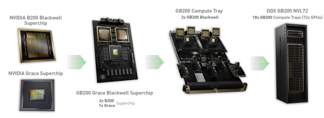 所以,整个机架就包括了36个Grace CPU(18×2),72个B200 GPU(18×2×2)。