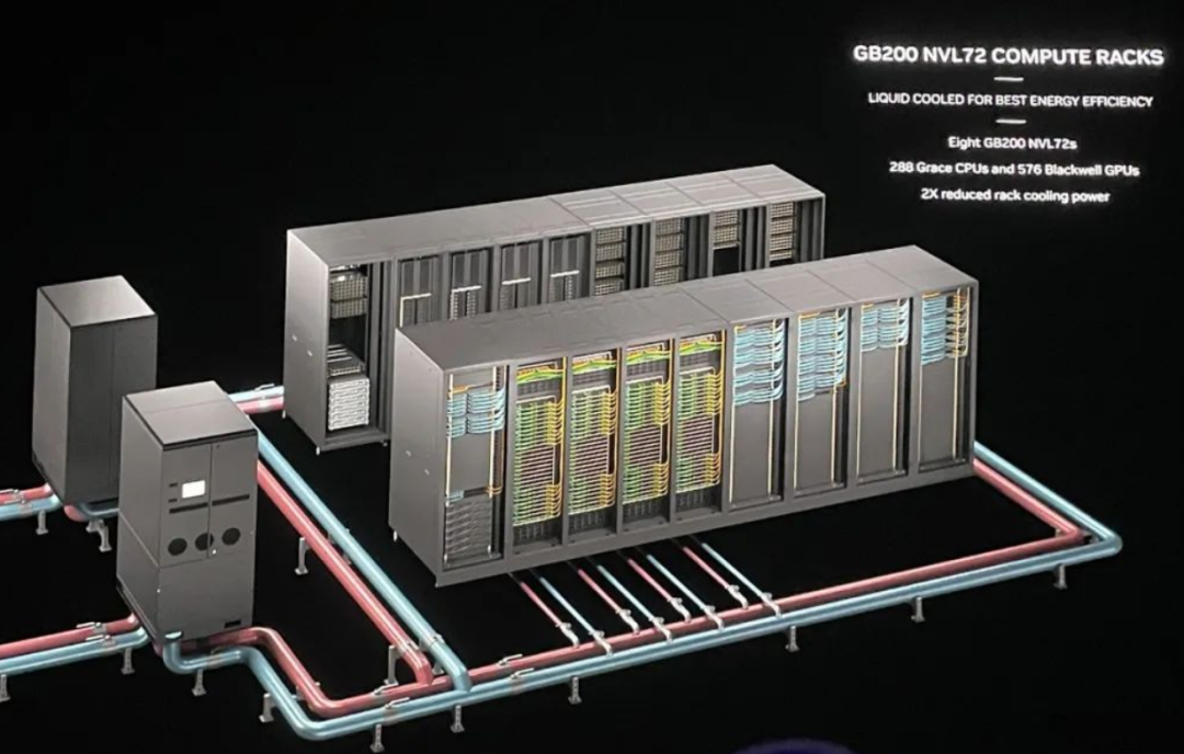 8个DGX GB200 NVL72,又可以组成一个576个GPU的SuperPod超节点,总带宽超过1PB/s,高速内存高达240TB。