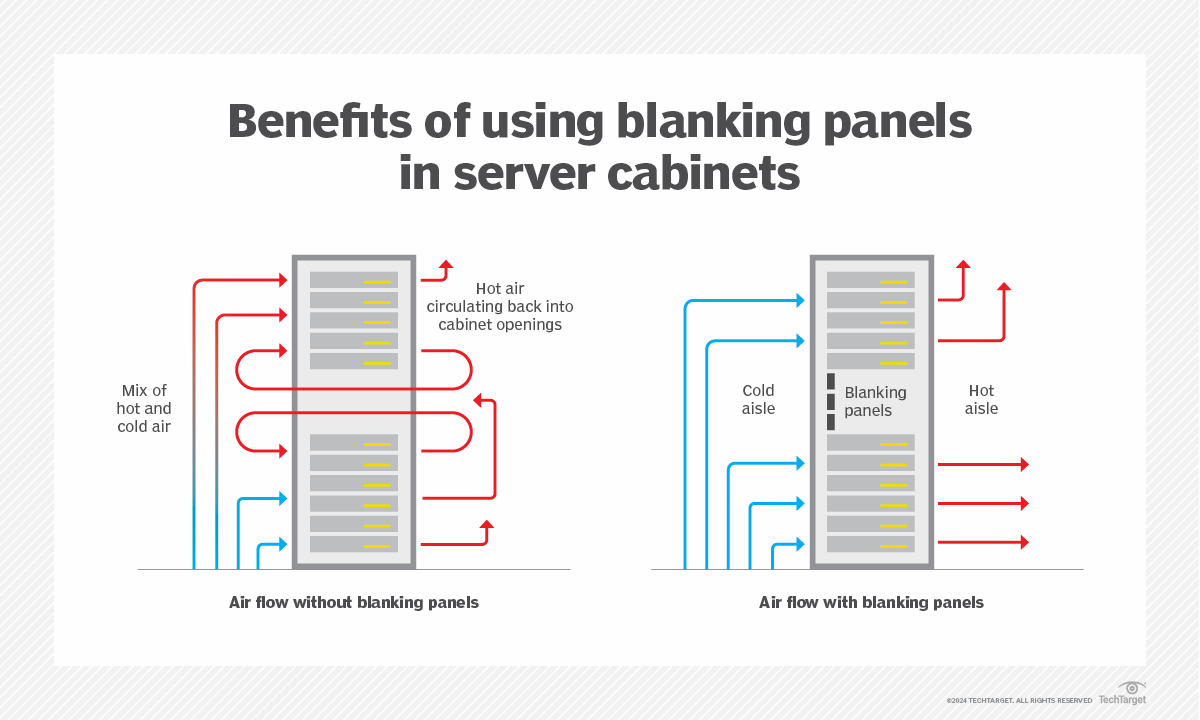在现代数据中心中,空白板非常有用,因为空置的机柜有未来增长的空间。使用空白面板或空白板可使冷热空气正常流过服务器机柜。如果没有这些面板或空白板,热空气会在数据中心内循环得更多,导致空调机组更频繁地启动。