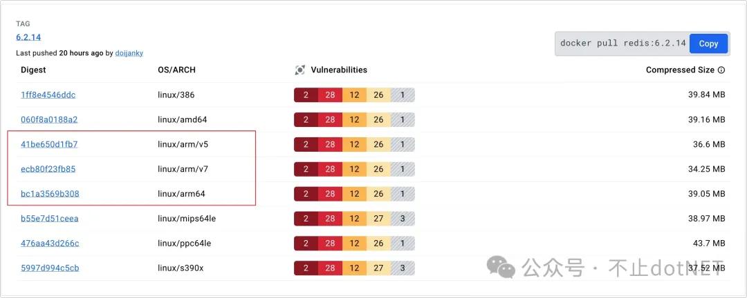 可能直接使用 docker pull redis:6.2.14 拉取到的镜像是兼容版本,因为看镜像大小,直接拉取的又 146MB ,特定版本只有几十MB 。
