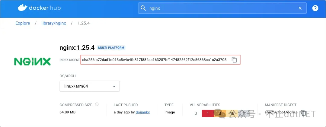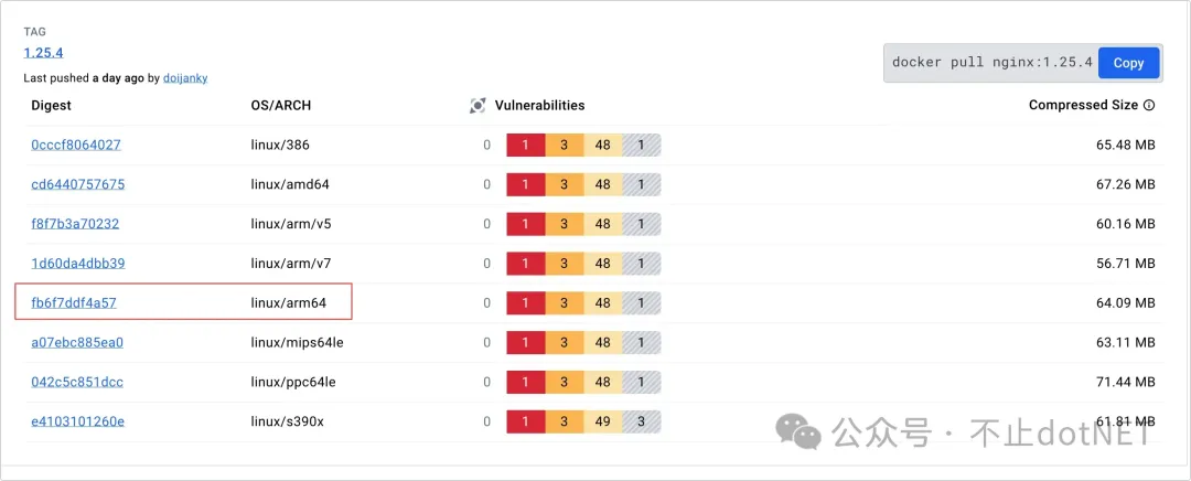 访问 https://hub.docker.com/_/nginx/tags?page=&page_size=&ordering=&name=1.25.4 ,进入到 Nginx 的 1.25.4 版本的页面。