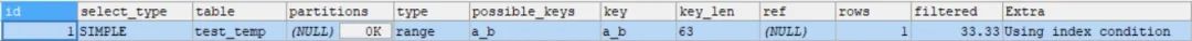 这个语句其实并不能使用联合索引第二个字段在存储引擎层做过滤,还是需要对每一条索引 a_b 上查询到的 id 做回表查询,但是执行计划里面却有索引下推,这也是需要注意的一点。