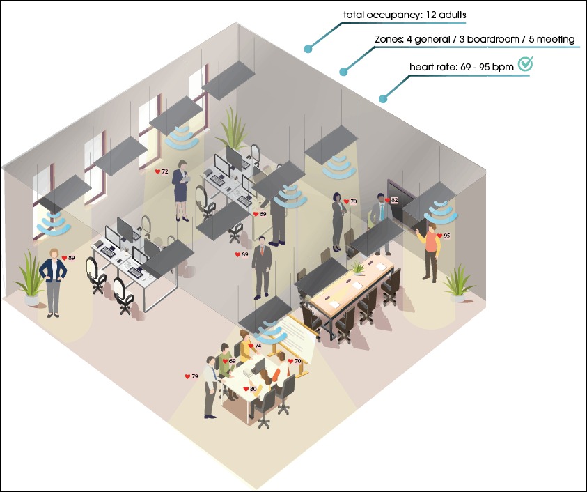 与天花板照明位于同一位置的 60 GHz RF 传感器提供有关空间使用情况和居住者生命体征的数据