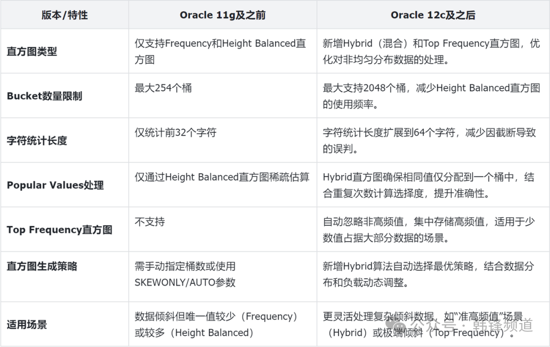 Oracle 最早在7.3版本引入直方图,但直到 Oracle 8i 版本后才逐渐成熟并广泛使用。下表以作为常见的11g版本为分界,对比总结了之前与之后直方图的功能演进。从下面这一表格中可见直方图的发展策略,一方面是支持更为多样的直方图类型,一方面是增加桶数,满足更为精准的数据描述,还有就是在文本处理、生成策略等方面的改进。这些也指导了国产数据库对直方图能力的支持。