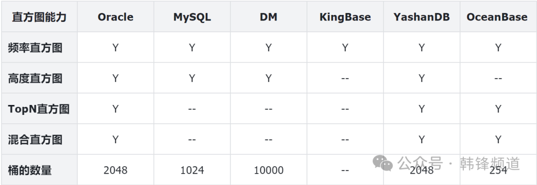 下面列举了几种常见的国产数据库直方图的能力,并与Oracle、MySQL加以比较。初步感觉,各国产数据库都支持了直方图能力,但支持范围不同,有些支持更全面些。此外,很多国产数据库都将直方图能力作为缺省的统计信息来收集,这点与Oracle 11g不同。