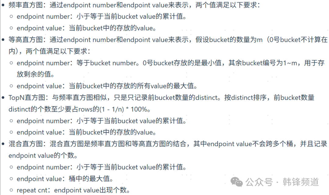 处理上述直方图类型外,还有为了反馈更“大众”数据的TopN直方图,满足更准确数据的混合直方图等等。
