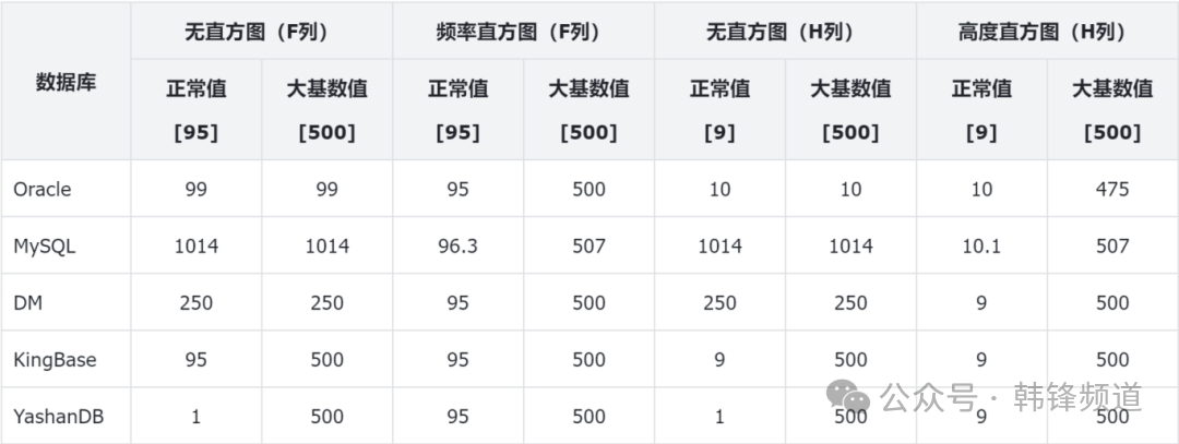 下面针对部分国产数据库做了直方图的测试。这里构造了一张表,包含10000条记录,两个字段FNUM、HNUM分别对应100个和1000个不同值。为了构造倾斜,还将500条数据修改为9999来表示大基数的数值。在收集直方图时,统一使用200个桶来进行测试。下面表格标题栏[]里为实际记录数,单元格内为执行计划中反馈预估行数。从各家执行情况来看,收集直方图后的评估还是很准确的。