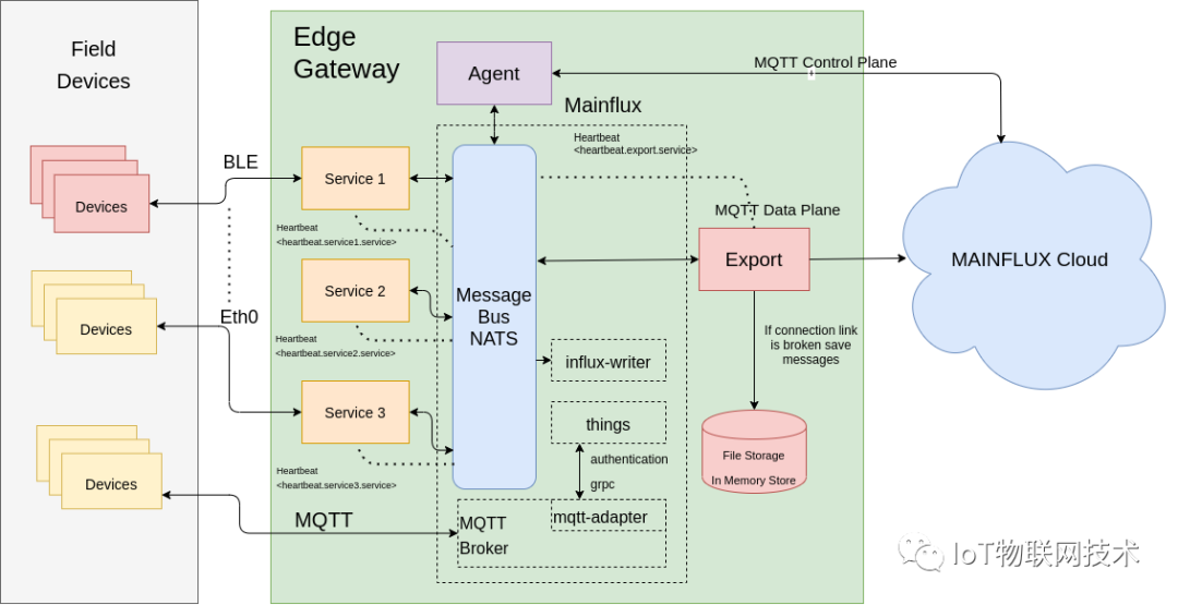 Mainflux 服务支持设备管理和 MQTT 协议,NATS 是中央消息总线,因为它是 Mainflux 中的默认消息代理,它也成为其他服务的中央消息总线,以及任何新的自定义Agent开发Export的服务,这些服务可以构建为与网关上具有任何硬件支持接口的设备,这些服务会将数据发布到消息代理,Export服务可以在消息代理中获取数据并将其发送到云。