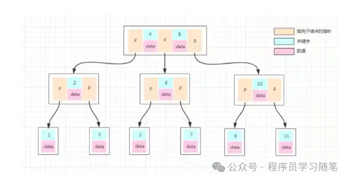 有了上述操作成本问题,接下来就对于二叉搜索树进行改良,第一个版本是B树,其特点和结构如下,可以看到一个元素就是一个数据: