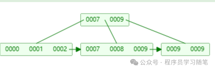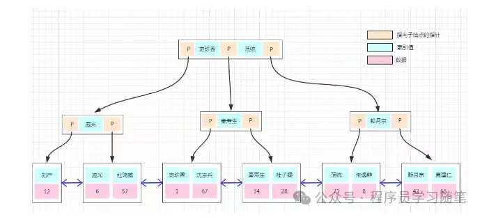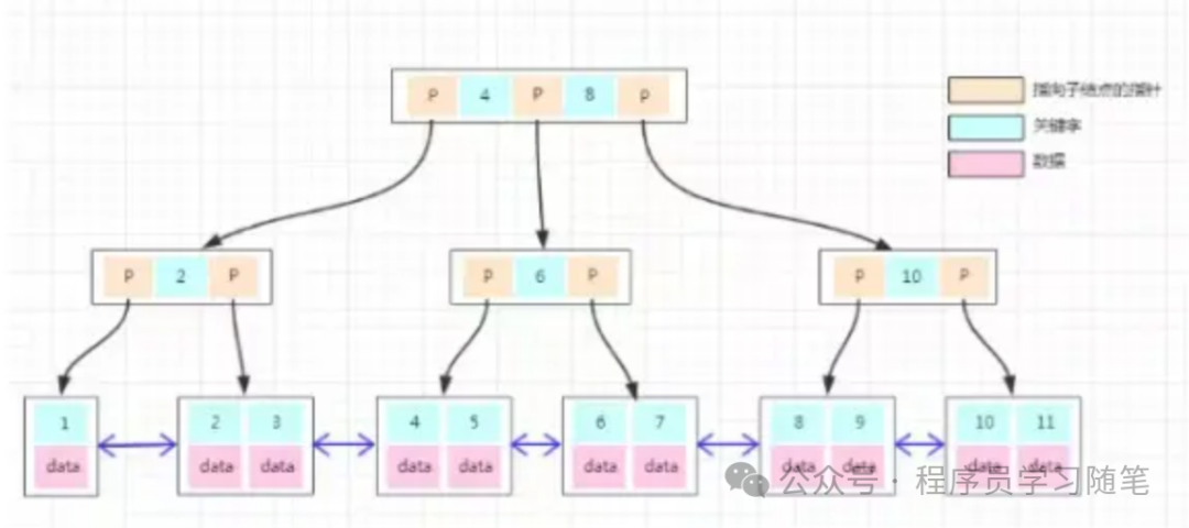 可以看到B树数据和key存在一起,这样一个页面存储的索引信息就会极大减少,同时范围扫描要不断回到父节点,造成更多的磁盘io,B+树对于这两点进行了改进,其结构如下: