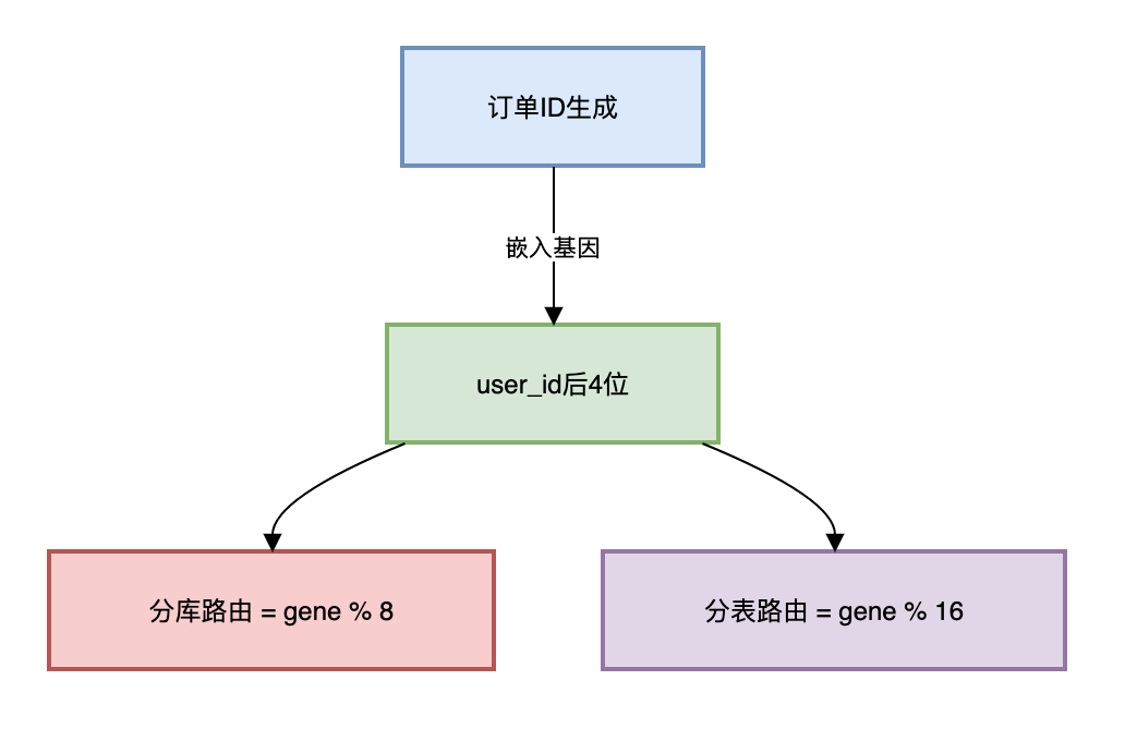 关键突破:通过基因嵌入,使相同用户的订单始终落在同一分片,同时支持通过订单ID直接定位分片