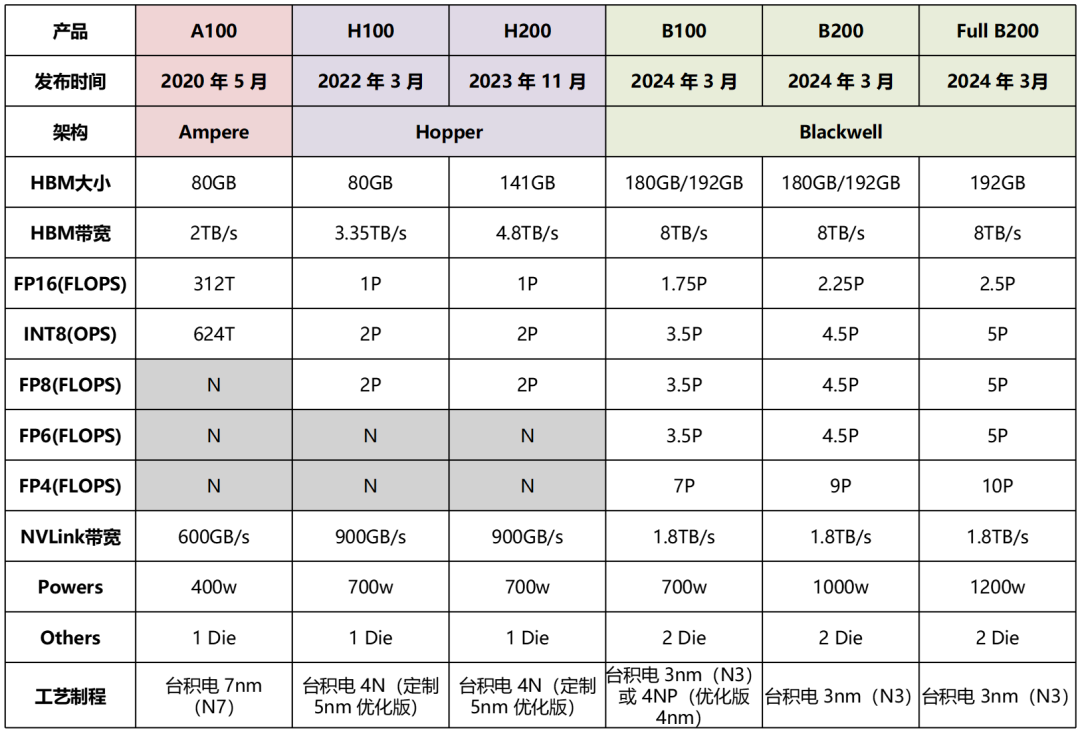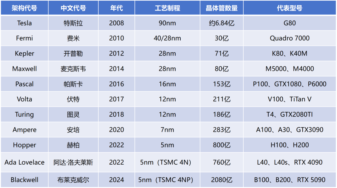 例如,基于Volta(伏特)架构的V100,基于Ampere(安培)架构的A100,基于Hopper(赫伯)架构的H100、H200,基于Blackwell(布莱克威尔)架构的B100、B200等。