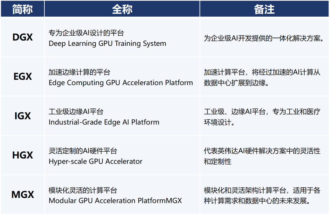 基于刚才的各种芯片平台,英伟达构建了对应的计算机平台,或者说,叫做超级计算机平台,包括DGX、EGX、IGX、HGX、MGX等。