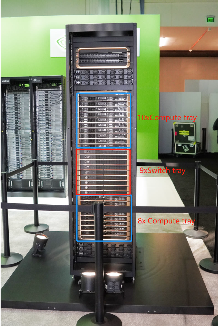 每个Compute Tray包括2颗GB200超级芯片。所以,就是36个Grace CPU(18×2),72个B200 GPU(18×2×2)。