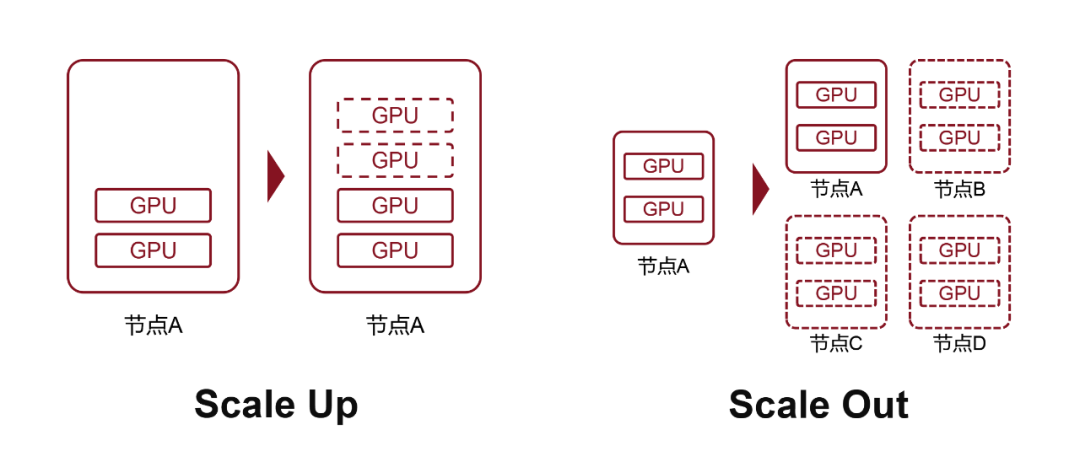 单节点内,不断加GPU,是Scale Up(纵向扩展)。单节点到了一定规模,就不好再增加了。就要增加节点数量,搞节点与节点之间的互连,那就是Scale Out(横向扩展)。