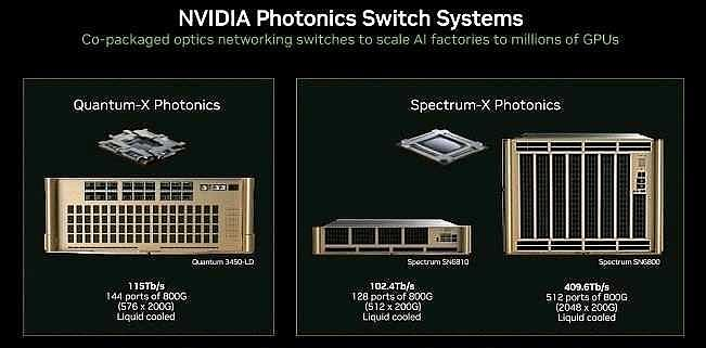 对了,前段时间,英伟达还发布了CPO光电一体化封装网络交换机Spectrum-X Photonics和Quantum-X Photonics。