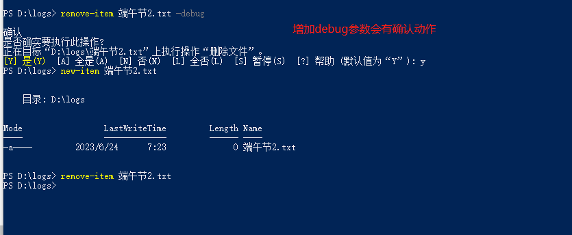 创建一个文件,增加-debug 参数会有确认提示,反之则没有。