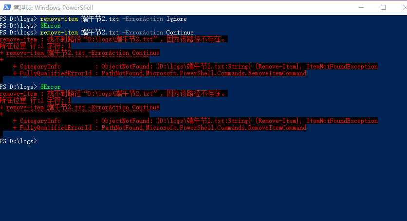 ErrorAction 参数主要用来指定命令和脚本执行出现错误后的操作,对于PowerShell环境全局默认使用ErrorActionPreference参数指定出现错误后的操作,我们可以通过ErrorAction参数覆盖默认的参数,从而满足我们的使用要求。