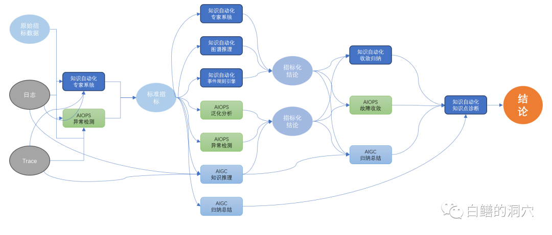 上面是我最近一直在思考的智能化分析引擎的未来模型,这个模型会结合专家系统、智能化运维系统、AIGC三种不同的技术框架来完成一个具体的分析任务。为了实现三者能够协同工作,指标化是核心。整个过程中,需要构建一套通用的“国际语言”,让多种分析引擎能够综合利用共同分析的结果。在这张图中,我们可以看到,基于知识自动化的“运维知识点诊断”是确认诊断结果的最后一个环节。无论前面采用什么方法进行泛化、分析、归纳、抽象。最终必须通过十分确定的“自动化诊断”,才能确定问题,得到结论。AIOPS的最后一公里是“运维知识自动化”。