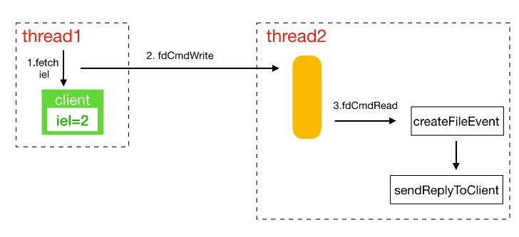 如上文所提到的,一个链接的创建、接收数据、发送数据、释放链接都必须在同个线程执行。异步发送涉及到两个线程之间的交互。KeyDB通过管道在两个线程中传递消息: