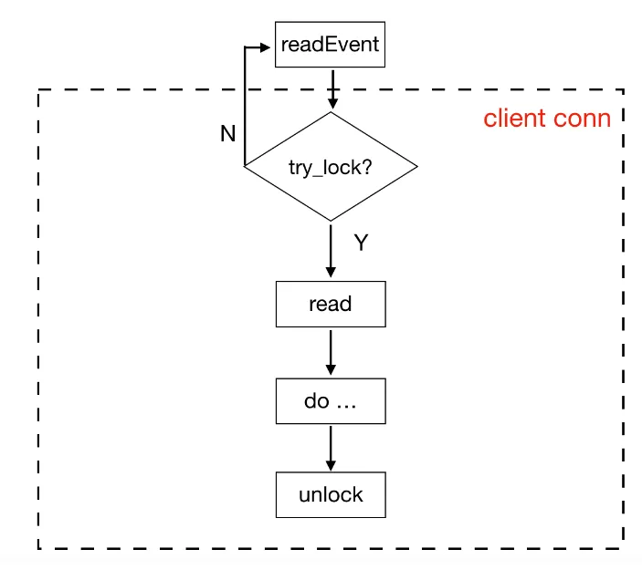 try_lock:一次获取失败,直接返回lock:忙等,每1024 * 1024次忙等后使用sched_yield 主动交出cpu,挪到cpu的任务末尾等待执行。在KeyDB中将try_lock和事件结合起来,来避免忙等的情况发生。每个客户端有一个专属的lock,在读取客户端数据之前会先尝试加锁,如果失败,则退出,因为数据还未读取,所以在下个epoll_wait处理事件循环中可以再次处理。