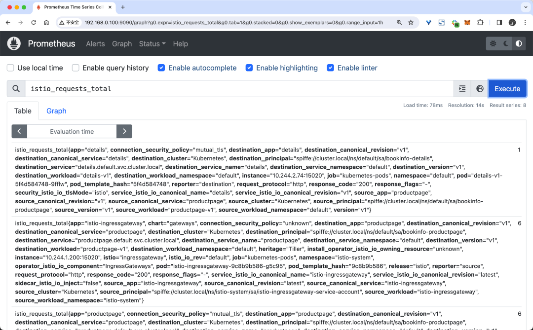 打开后我们可以在页面中随便查询一个指标,比如我们查询 istio_requests_total 指标,如下所示: